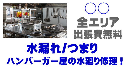○○バーガーショップシンク水漏れ / ○○ハンバーガー屋蛇口水漏れ / ○○ファーストフード排水パイプつまり / ○○マクドナルド給湯器修理